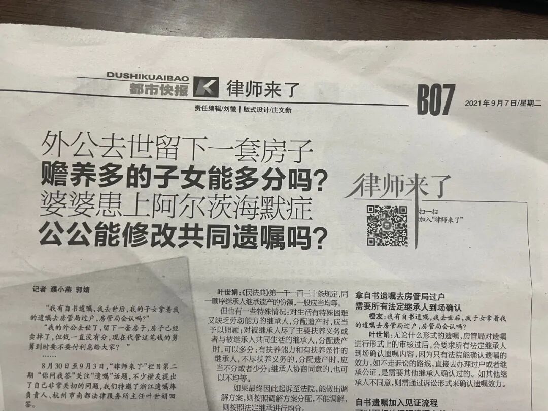 8月30日至9月3日,“律师来了”栏目第二期 “你问我答”关注“遗嘱”话题,不少橙友提出了自己非常关切的问题,浙江遗嘱库负责人、杭州市南都法律服务所主任叶世娟对这些问题进行回答。